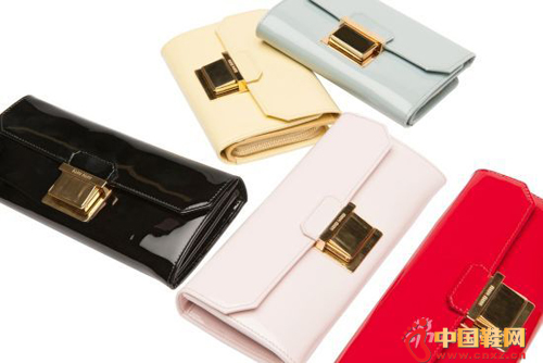 【中国鞋网-品牌动态】Miu Miu此次对漆皮和Madras皮革这两种材质,进行了全新色彩组合的尝试,隆重推出以金色锁扣为特色的小型皮具系列。
