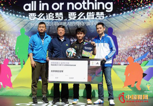 【中国鞋网-品牌动态】作为2014年FIFA世界杯的官方合作伙伴,为所有喜欢足球、喜欢世界杯的中国青少年开启了追逐梦想的足球之旅。阿迪达斯此次特别推出2014年FIFA巴西世界杯护旗手选拔活动,最终将会有来自北京、上海、广州、成都的4名青少年将脱颖而出,荣耀担任巴西世界杯半决赛的护旗手任务。