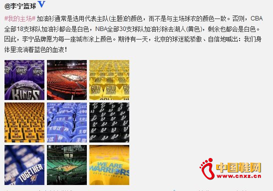 微博全文如下:“#我的主场#加油衫通常是选用代表主队(主题)的颜色,而不是与主场球衣的颜色一致。否则,CBA全部18支球队加油衫都会是白色,NBA全部30支球队加油衫除去湖人(黄色),剩余也都会是白色。因此,李宁品牌愿为每一座城市涂上颜色。期待有一天,北京的球迷能骄傲、自信地喊出:我们身体里流淌着蓝色的血液!”