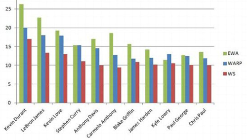 自上个赛季的爆发以来,库里就已经被看做联盟顶级的球员了,而本赛季他的表现似乎有些让人忽视,但是他的WARP值和WS值都排在了联盟第四,就连受勇士全队防守影响的EWA值也排在联盟第七。但是问题就在于,勇士并没有打出预期的战绩。