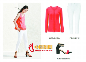 橘红色是Esprit 2014春夏的主要配色之一。一件引人注目的橘红色上衣,搭配一条明快的白色长裤,能让你轻松在人群中跳脱出来,尽情闪耀。上身飘逸的雪纺面料和下身贴合的修身长裤形成对比,打造出休闲而精致的时尚韵味。再配上一双红黑拼色的粗跟凉鞋,鞋面的红色元素与上身的橘红色相互呼应,增强整体的色彩协调感,使整套服饰在细节上更显精致,让你无论是在闺蜜聚餐还是在情侣约会中,都能随性出彩,魅力无限。(中国鞋网-最权威最专业的鞋业资讯中心。合作媒体:)