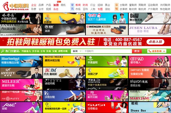 中国鞋网,是了解鞋业市场供求信息的窗口,是鞋业进行市场推广的最佳途径。其以强大的品牌战略、全新的运营模式、全面的市场推广、一站式服务等优势稳居行业前茅。中国鞋网热忱地欢迎鞋类、鞋机类、鞋材类等众多商家加盟网站,也期盼与其它各行业单位携手共赴商机,共谋发展,齐心协力创造电子商务新格局!
