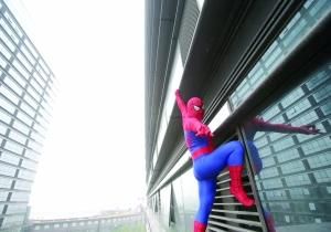 16日下午,几张“蜘蛛侠攀爬南京百米地标”的惊险照片,在网上蹿红。一位男青年,身穿蜘蛛侠的红蓝紧身衣,面对一幢高层建筑的蓝色玻璃幕墙,竟然徒手攀爬到高处,并且摆出吐丝、贴壁等各种造型,萌翻了网友。