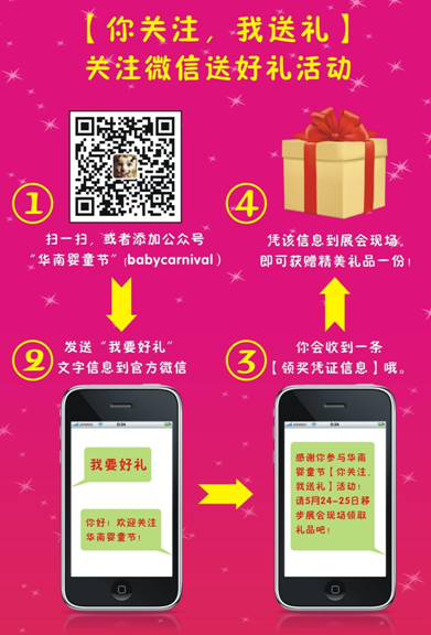 成功关注后,发送“我要好礼”字样到“华南婴童节”,即可得到精美礼品一份!