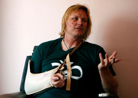 奥尔教授今年44岁,正和团队在喜马拉雅山脉收集冰雪样本,来研究该山脉的污染以及冰川融化状况。然而他不慎坠入冰缝,伤势惨重。爬回到营地后,他立刻在网站上发出请求:“呼叫国际救援。约翰已经摔断手臂肋骨,内脏出血。坠入70英尺深的冰缝。现已爬出,在Himlung二号营地等待救援。请速到。”然而由于恶劣的天气,直升飞机并不能在当天到达,奥尔教授只好忍受一晚的疼痛,等待第二天的救援。目前奥尔教授正在加德满都(尼泊尔首都)的一家旅馆进行康复治疗。