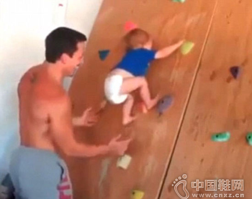【中国鞋网-攀岩新闻】在一段15秒的视频中,一名婴儿正矫健地进行室内攀岩,并且没有佩戴绳子。这名婴孩只有20个月大,身份未明,穿着蓝色T恤和一条尿布,赤脚攀爬在几乎垂直的墙面上,依靠的仅仅是自己手脚的力量。
