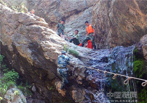 当日9时30分,官兵们到达了第一道瀑布的脚下。“死者在第一道瀑布与第二道瀑布中央。由于山上都是巨型石块,几乎没有路可走,经过考察我们只好一个人先上去,固定好支点后放下安全绳,再一个个爬上去的。”呼和浩特市消防支队土左旗消防大队一中队队长刘浩宸告诉记者,带着装备爬上去后,消防官兵看到死者在第二道瀑布脚下的树丛中。山上乱石多,到处都是扎人的植被,根本没有下脚的地方。经过研究,他们找了一条相对好走的路线。消防官兵先用附近的木棍开拓出了一条道路,把死者固定在担架上。但是由于瀑布太高了,官兵们只能把安全绳打上结,把死者一点点的吊下来。一路上像这样落差比较大的地方有三四处。
