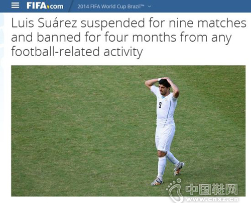 【中国鞋网-体坛快讯】据国际足联在里约热内卢当地时间周四举行的新闻通气会上正式宣布,因为在乌拉圭与意大利的比赛中犯下“牙咬对方后卫基耶利尼肩膀”的恶劣行径,乌拉圭队前锋苏亚雷斯被国际足联下属的纪律委员会处以禁赛9场,以及不能参加一切与足球相关活动4个月的处罚。这同时意味着,苏神的巴西世界杯之旅已经宣告结束。