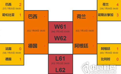 半决赛,巴西vs德国,荷兰vs阿根廷。四强球队中巴西、德国、阿根廷总共加起来有10座冠军奖杯,占据19个冠军的一半以上;而荷兰3次获得亚军,巴西2次亚军,阿根廷2次亚军,德国4次亚军,总共有11个亚军,也占据一半以上。