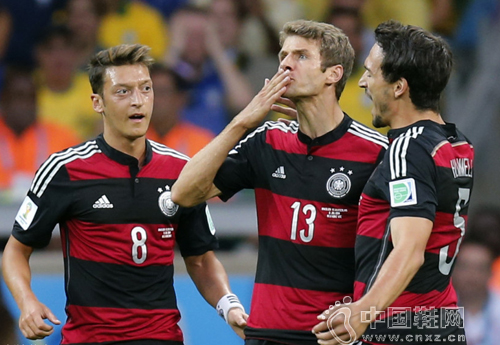 【中国鞋网-赛事追踪】世界杯首场半决赛在贝洛奥里藏特米内罗球场展开较量,德国7比1狂屠巴西,创造8进决赛的纪录。穆勒打进个人本届第5球。此后德国7分钟内连下四城,克洛泽以16球超过罗纳尔多,创造世界杯进球新纪录。克罗斯梅开二度,赫迪拉1传1射。德国成为世界杯史上首支前半小时打进5球的球队。下半时,替补许尔勒再添两球,奥斯卡打进安慰球。德国成为首支世界杯半决赛打进7球的球队,巴西1975年以来主场正式比赛首败,追平94年前的输球纪录(美洲杯0比6负乌拉圭)。