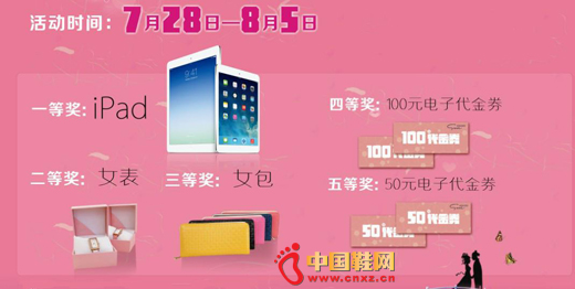 即日起至8月5日,官方微信开启“因微有你,鞋手相爱”的微信刮刮卡活动,Ipad、韩国圣恩熙精美女士手表、韩国圣恩熙时尚女士钱包,更有上万份圣恩熙50元现金券以及100元现金券,上千对时尚真皮女鞋等着你去挑选!幸运如你,能不心动吗?