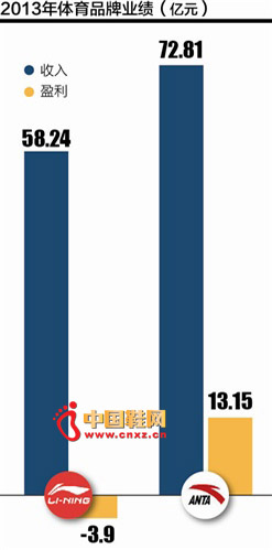2013年,李宁实现收入58.24亿元,亏损3.9亿元。而安踏则是收入72.81亿元,盈利13.15亿元。(中国鞋网-最权威最专业的鞋业资讯中心。合作媒体: )