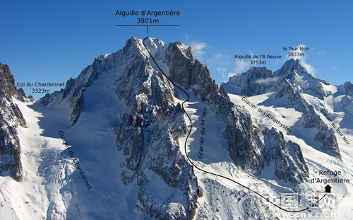Aiguille d Argentiere峰西壁 黑色线路为滑雪路线
