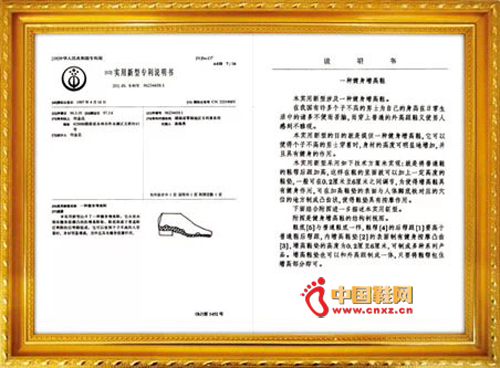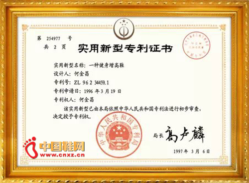 三、中国内增高鞋发明人,国家专利持有者;广州火森—畅丰鞋业有限公司董事长兼总经理何金昌先生是中国内增高鞋发明人,并于1997年获得国家专利。相较于那些模仿者,何金昌纯正内增高鞋创始者的身份无法改变!