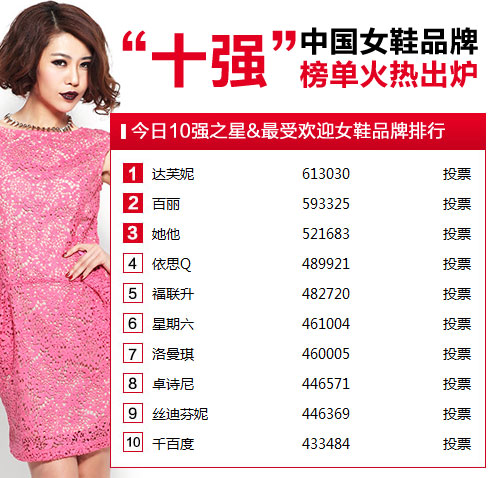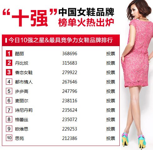 中国鞋网携手网友共同见证了中国女鞋行业一线品牌的诸强纷争及新锐品牌的快速崛起,在此恭贺每一家荣获女鞋十强的企业,希望能在接下来发展中再接再厉,争取登上鞋业市场更加华丽的舞台!