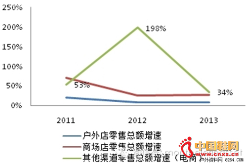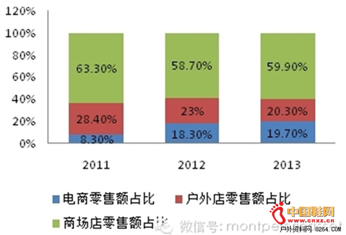 同时,随着中国城乡网络的逐步普及,户外用品电子商务市场的规模逐步扩大,据COCA统计2012年国内网络等其他渠道户外用品的零售总额已达26.5亿元,较去年同期增长了186.52%,远高于行业平均增速,2013年也有34%的增长,依旧快于其他渠道。而电商零售额的占比也是逐年提升。消费者的购物渠道呈现更加丰富化和便捷化,对户外用品的需求也在逐步细分。(中国鞋网-最权威最专业的鞋业资讯中心。合作媒体: )