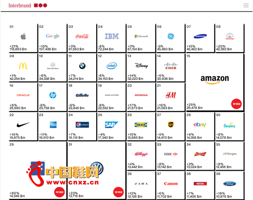 【中国鞋网-品牌观察】广告巨头宏盟集团(Omnicom)旗下的品牌咨询机构 Interbrand 发布2014年全球100大品牌榜,苹果蝉联第一,Google 和 可口可乐继续紧随其后。