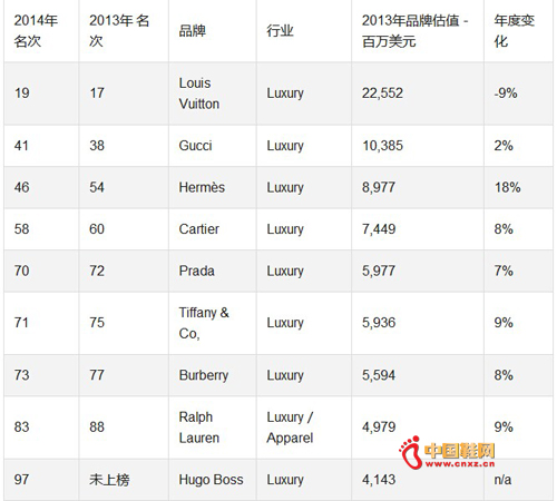 2014年度:全球百大品牌及奢侈品排名