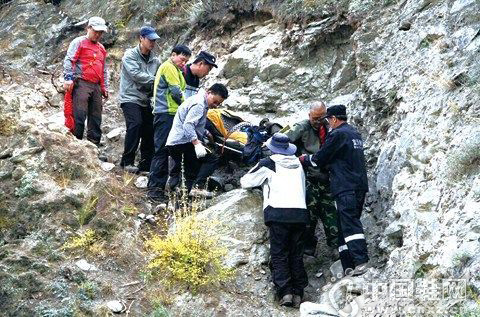 9月30日9时55分,救援队顾不上休息,2辆车8人继续深入,车辆行驶5公里后因山路陡峭难以通行,救援队员随即携带便携式硬质担架徒步赶往救援地,其余队员建立临时大本营原地待命,负责后勤保障及通信联络工作。12时,特克斯县医院救护车到达临时大本营,一同待命。11时50分,姜勇带领前方救援队员到达伤者跌落地点,发现伤员并了解伤情。经现场初步检查,伤员身体多处擦伤,胸口有疼痛感,其他正超怀疑肋骨骨折。救援队员立即将受伤队员平移至硬质担架,捆扎固定完毕,确定搬运路线。13时,队员们开始搬运伤员下山。山上垂直距离200米,来回绕行1.2公里的山路,坡度很大,一路上都是茂密的松林、长满刺的灌木,给伤员转移带来极大困难。经过近4个小时的挪移,17时,救援队将伤员运至科克苏河岸边,沿传统牧道继续下撤。22时20分到达车辆处,将伤员转移到救护车上。伊犁红十字蓝天救援队全体队员开始下撤,与县医院救护人员一同返回,伤员转移至县医院短暂观察处理后,送至州友谊医院进行进一步救治,目前确定为脊椎骨折,病情稳定。