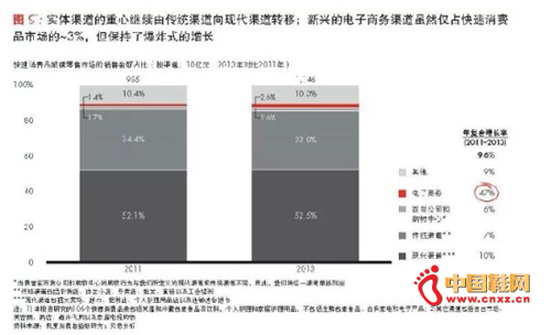 实体渠道在2013年仍占据快速消费品市场超过97%的零售份额。随着不同零售业态格局的演变以及消费者购物行为的改变,实体渠道的重心继续由传统渠道向现代渠道转移。以超市和大卖场为主要代表的现代渠道占据快速消费品市场销售总额的一半以上,并以每年10%的速度增长。随着现代渠道在消费者购买次数和年度支出中的占比不断提高,其相对于传统渠道的重要性在所有级别的城市中日益凸显。