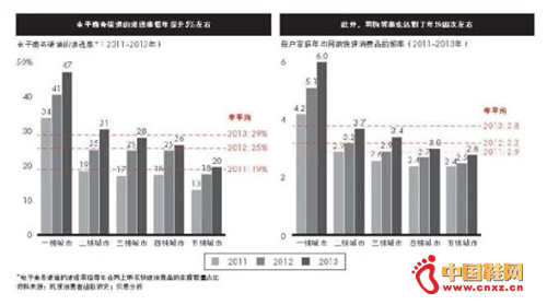快速消费品零售市场增速在所有级别的城市中均出现显著放缓。其中,一线城市的增长率由2012年的8.6%降至2013年的3.5%,二线城市的增长率由10.7%降至7.4%,三线城市的增长率由12.4%降至8.4%。