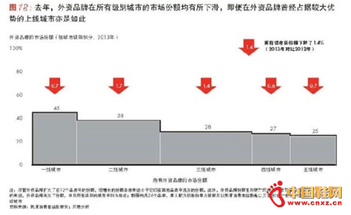 总体来看,大约六成外资品牌在2013年丢失了市场份额。即便在外资品牌总体份额增长的品类中,不少外资品牌也出现了份额流失。同时,外资品牌在所有级别城市的市场份额均有所下滑,包括外资品牌占据较大优势的上线城市。市场份额的变化主要源于外资品牌渗透率在各个级别城市中的下滑。