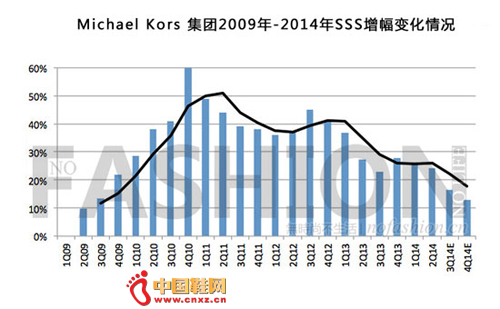2014年对于零售行业,特别是时尚产业来说可谓是“寒冬中的黑夜”,欧美经济复苏缓慢;厄尔尼诺造成的暖冬;中国经济放缓及反腐;香港、乌克兰、东南亚等地地缘政治紧张情绪;上述情况带来的旅游消费减少等诸多因素给本来陷入困难中的行业带来格外沉重的打击。因此Michael Kors将二季度及三季度的同店销售放缓归功于“商场人流减少”、“消费情绪低迷”可以说是一种事实表达,但是……问题来了,上述两个理由已经不仅仅出现先本季度了,甚至不仅仅出现在本财年了,同样的理由也许可以用来解释Coach蔻驰的问题,其实Coach蔻驰要更惨,Coach蔻驰的SSS不要说增长放缓了,几个季度以来一直是双位数下跌。但是行业分析师不可能用评价Coach蔻驰的标准来评价Michael Kors,因此Coach蔻驰的北美SSS尽管暴跌24%但是业绩胜预期华尔街就会对其追捧;相反Michael Kors尽管业绩超预期,但是只要毛利率或者SSS任何地方出现一点问题,股价就会出现恐慌或者报复性下跌,这是华尔街和投资者的逻辑。这种逻辑在投行的报告中也得到体现,Goldman Sachs高盛分析师Lindsay Drucker Mann的报告就表示,行业放缓导致不得不降低对Michael Kors的增长预期,但是Michael Kors等新一代轻奢品牌仍在崛起Coach 蔻驰流失的份额。投行Jefferies LLC分析师Randal Konik甚至表示股价下跌可以让跟多投资者入市,一旦欧洲市场呈规模则会催化品牌。同样的情况,BMO Capital Markets分析师John Morris得出的结论是Michael Kors的欧洲增长不足以抵消品牌北美减速,因为北美市场的份额占足8成。上述投行也各自对Michael Kors的股票评级进行了相应调整。