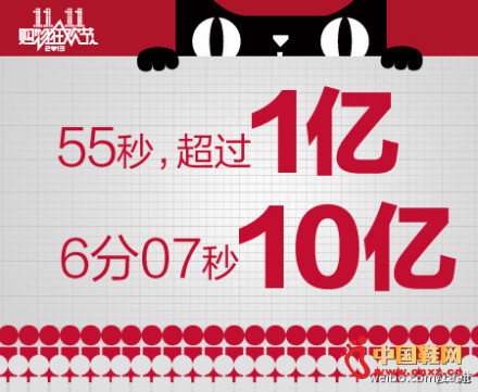 【中国鞋网-数字新闻】11月11日13:31,杭州阿里总部的5号报告厅内,大屏幕上打出了“13点31分,成交超过2013年双11全天,感谢每一个人!”