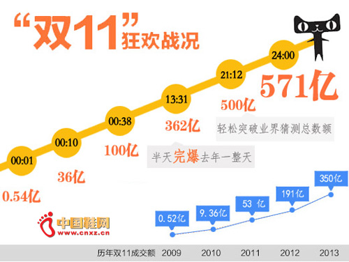 【中国鞋网-数字新闻】当秒针跳转到11月11日零时,阿里巴巴“双十一”购物狂欢节的实时交易数据就像脱缰的马,一路驰骋。