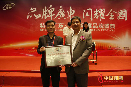 广东省连锁经营协会会长孙雄为圣恩熙品牌女鞋颁发“2014年度广东省优质特许加盟总部”