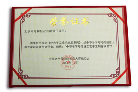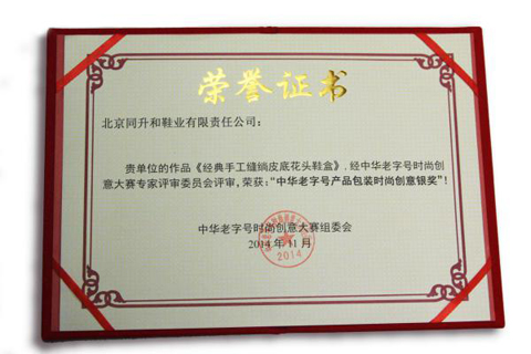 【中国鞋网-品牌观察】由中国商业联合会中华老字号工作委员会主办的2014年度“中华老字号时尚创意大赛”于2014年11月18日完美落下帷幕。此次大赛同升和选送的经典手工缝绱皮底系列产品和包装,分别获得中华老字号创始产品时尚创意银奖和中华老字号产品包装时尚创意银奖,是此次大赛全国参赛鞋企获得的最高奖。