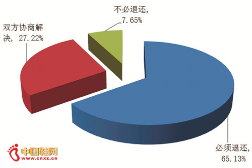 本次调查发现,在这一点上,受访者普遍还是通情达理的。65.13%的受访者认为赠品必须退还,27.22%的受访者认为这一问题可以由双方协商解决,只有7.65%的受访者认为赠品不必退还。