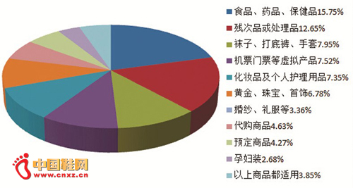 调查中消费者对于部分商品不适用“7日无理由退货”表示认同,并表示不是所有商品都适用“7日无理由退货”。将部分商品排除在外其实是对更多消费者利益的保护。对不适合“7日无理由退货”的商品的选择排列中,认为食品、药品、保健品不适用“7日无理由退货”的消费者占15.75%;认为内衣等贴身用品不适用“7日无理由退货”的消费者占15.12%;认为残次品或处理品不适用“7日无理由退货”的消费者占12.65%;认为秒杀清仓商品或特价商品不适用“7日无理由退货”的消费者占8.09%;认为袜子、打底裤、手套不适用“7日无理由退货”的消费者占7.95%;认为机票、门票等虚拟产品不适用“7日无理由退货”的消费者占7.52%;认为化妆品及个人护理用品不适用“7日无理由退货”的消费者占7.35%;认为黄金、珠宝、首饰等价值高的商品不适用“7日无理由退货”的消费者占6.78%;认为婚纱、礼服等不适用“7日无理由退货”的消费者占3.36%;认为代购商品不适用“7日无理由退货”的消费者占4.63%;认为预定商品不适用“7日无理由退货”的消费者占4.27%;认为孕妇装不适用“7日无理由退货”的消费者占2.68%;而认为以上商品都适用““7日无理由退货””的消费者占3.85%。