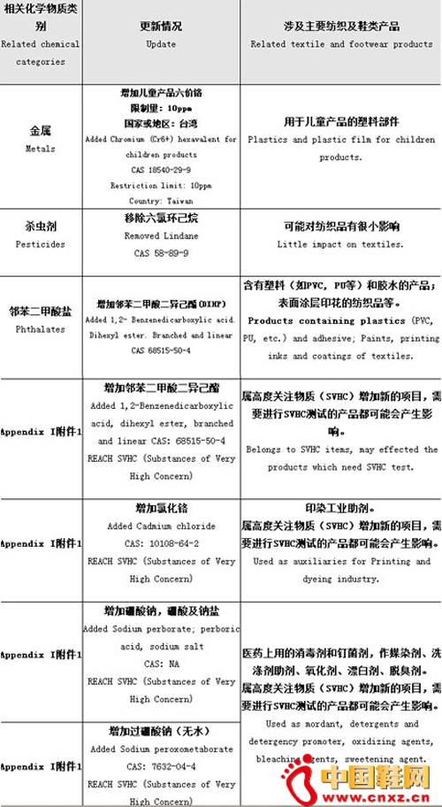 【中国鞋网-国际动态】2014年12月9日,美国服装及鞋类产品安全协会(AAFA)在孟加拉国首都达卡举行的美国国际产品安全、工人安全及供应链符合性会议上发布了最新受限物质清单,其中增加的受限化学物质邻苯二甲酸二异己酯、氯化镉、硼酸钠,硼酸及钠盐、过硼酸钠(无水)都涉及到纺织服装、鞋、旅行用品、家用纺织品和其它配件。另外清单中移除了六氯环己烷,此类物质可能对纺织品影响比较小。