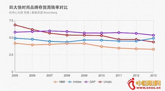 根据市场研究公司Gartner 公布的2014 年供应链管理公司Top 25 榜单(The Gartner Supply Chain Top 25),Zara 母公司Inditex 和H&M 分别位居第11 、第13。优衣库并未进入此榜单,而单就“库存周转”这个单一要素来看, Inditex 和H&M 分别为90 天和100 天。优衣库财报披露的这个数据只有83.72 天。