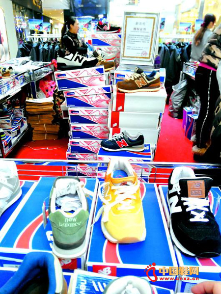 24日上午,记者在经四路万达广场进入室内步行街,即看到了王先生所说的新百伦促销区。促销区没有店面,只是由新百伦蓝色经典鞋盒整齐摞成货架后,三四十款鞋样摆在上面销售,五六位销售人员在叫卖,称新百伦5折特价销售。从外观上,记者看不出鞋子和新百伦鞋的差别,各种款式相对齐全,试穿后感觉鞋底偏硬。