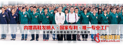 【中国鞋网-品牌观察】中国内增高鞋第一品牌——创立20年来,坚持自主开发、自主生产、自主销售、对外贴牌服务,建立了中国最大的内增高鞋研发、生产基地,树立了专业、高档、舒适的品牌形象,营造出精诚团结、勇猛精进的团队氛围。