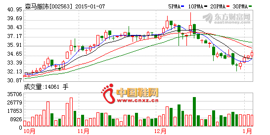自 12 月以来, 公司基本面良好运营, 但股价回调较多 , 因此, 我们认为公司的投资机会已然非常明显。 我们坚定看好公司未来的发展。 公司是服装板块的蓝筹,板块轮动从深蓝向浅蓝过渡时,森马是服装板块中最受益的。预期 15 年 EPS 达 2.15 元, PE 为 16 倍。在牛市氛围下,公司 PE 中枢随之提升,到达 25 倍是可以期待的,那么对应的将有 40%的股价上涨空间。维持“买入”评级。(中国鞋网-最权威最专业的鞋业资讯中心。合作媒体: )