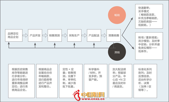 供应链循环往复,不断紧跟市场需求,实时缓冲调整。最终形成了“企业发什么货,门店销售什么货,门店什么货销售得好,企业再给门店什么货”的模式,门店的库存靠销售来拉动,门店的业绩也靠销售创造。(以ZARA为代表,鞋服企业建立快速供应链具体循环图)