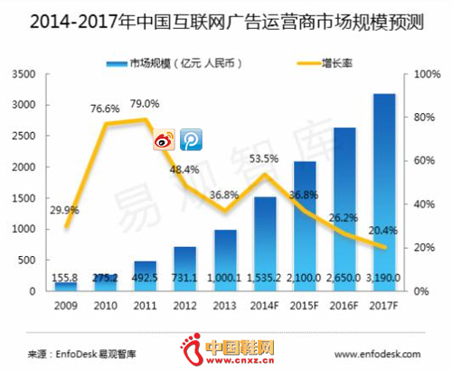 【中国鞋网-数字新闻】在继2010-2011年互联网广告市场的爆发后,2014年中国互联网广告市场再次迎来发展小高峰,市场规模预计达到1535.2亿元,较2013年增长53.5%。预计2017年市场规模将达到3190亿元。