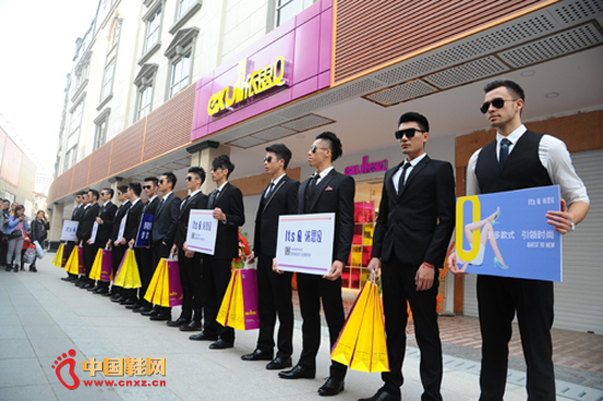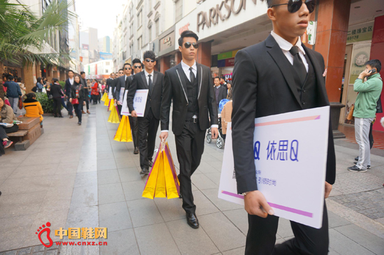 【中国鞋网-品牌动态】近日,南宁步行街惊现前所未有的露天街道时尚走秀,引发了市民的热议。十几个身高187CM以上的型男,穿着黑色西装、戴着黑色墨镜、拎着紫色手提袋,以优雅酷劲的姿态高调走过步行街。爆棚的颜值引来了路人的一路跟随和阵阵惊呼。
