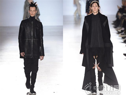 瑞克·欧文斯 (Rick Owens)设计的服装极简中带着丰富创意的哥特式设计,他善用黑白灰三色来打造摇滚味道,不对称层叠设计是瑞克·欧文斯的招牌设计。