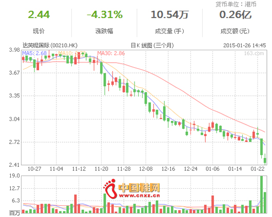 【中国鞋网-鞋企股市】美银美林发表报告指,达芙妮(00210.HK)2014年第四季及2014财年同店销售分别跌7.5%及3.4%,两者均逊该行预期。为反映其销售疲弱,加上推广成本上升,该行将其2014及2015年盈测调低50%及20%,目标价由4.05元调低至3.3元。现时股价已反映大部份负面因素,惟集团盈利能见度仍低,维持「中性」评级。