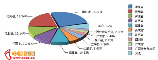 【中国鞋网-数字新闻】据国家统计局新近发布的数据显示,2014年12月,全国轻革行业完成产量5,444.07万平方米,同比增长-7.61%,环比增长11.32%。本月产量主要集中在浙江省、河南省、河北省、江西省、福建省等地区,其中浙江省以25.53%的占比居于首位,完成产量1389.81万平方米;河南省完成产量1052.82万平方米,占比19.34%;河北省完成产量606.57万平方米,占11.14%;江西省完成产量569.62万平方米,占10.46%;福建省完成产量550.92万平方米,占10.12%。