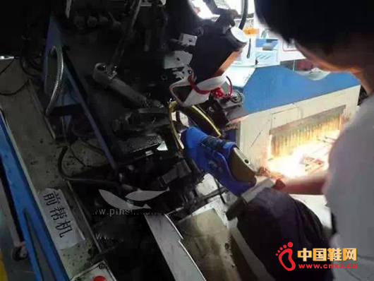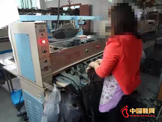 这是车缝中底板的车间,先把开放性的鞋面纳底,这是准备下一道工刷胶的前道。