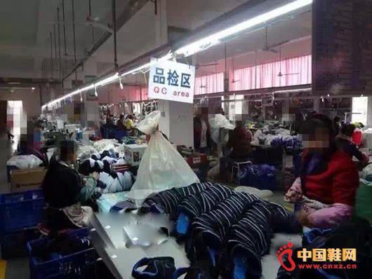 上图为车缝车间 ,鞋面就是在这里车缝起来的。这家工厂目前在赶制乔丹(中国)下的订单 大家可以从裁片LOGO上看出来。车好的鞋面送到品检区,由品检员检察 ,品检员还负责修理线头等一些工作。