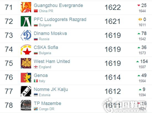 【中国鞋网-体坛快讯】北京时间3月4日消息,随着中超转会窗口的关闭,中超相关新闻不再以转会消息为主,但仍有一些消息值得中国球迷关注。足球数据统计网站“footballdatabase”发布了最新一期世界足球俱乐部排行榜,广州恒大以1622分位居世界第71位,在亚洲俱乐部中排名第1位。北京国安跻身亚洲俱乐部排名TOP20,位列亚洲第18位,山东鲁能和广州富力分别位居第38位和第45位。