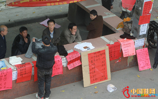 2015年3月1日,东莞长安镇,春节长假过后,陆续开工,不少企业人手紧缺纷纷招聘员工,街头再现招工潮,不过,即使提高了工资待遇,不少企业还是因为遭遇了节后的招工难而犯了愁。图为招工者在工厂围墙外,坐着小板凳等待打工者前来求职。(中国鞋网-最权威最专业的鞋业资讯中心。合作媒体: )