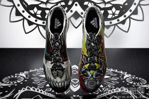 【中国鞋网-时新装备】adidas 近日为旗下足球靴 adizero F50 打造一双全新的「Tatto」限量版本。设计上通过两只鞋来诠释「Love」和「Hate」的主题,其中「Love」采用彩色主调以及心形和玫瑰等充满浪漫气氛的图案来呈现;而「Hate」则以黑白色的骷髅图案贯穿鞋身。此外此番限量版本的 F50 还搭载了全新的创新性能,其中包括了能够提高控球速度以及球感的 3D Dribbletex 面层,而前掌的螺旋架构以及第二层牵引层能够为球员提供最大的操控性。(合作媒体: )