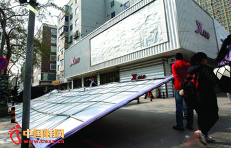 【中国鞋网-滚动快讯】昨日下午3时许,沈阳市皇姑区“专卖店”门前掉落的广告牌依然倒在路面的停车位上。